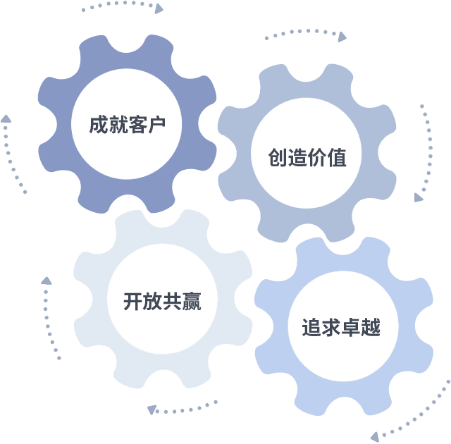 成就客户是一切决策的出发点,,,,创造价值是衡量所有工作的标准,,,追求卓越是我们做事做人的态度,,开放共赢是我们的格局也是最终的结果。。。价值观的齿轮环环相扣,,推动着组织里的每个人不断向前。。。。